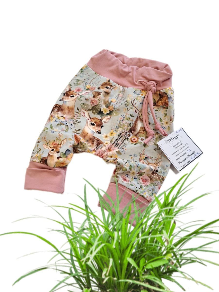 Baggy hlačke z vzorcem SRNICE, ki otroku dajejo maksimalno udobje, zaradi elastičnega materiala. Hlačke imajo podaljšane patente, kar pomeni, da se sprva nosijo zavihani patenti, potem pa se jih počasi prilagaja na rast otroka. Hlačke imajo v pasu funkcionalno vrvico.