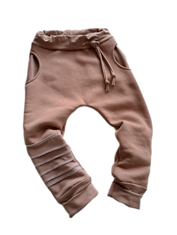 Enobarvne kosmatene baggy hlačke, ki otroku dajejo maksimalno udobje, zaradi elastičnega materiala. Hlačke so v notranjosti kosmatene in so idealne za prehodna obdobja ali pa za mrzle zimske dni. Hlačke imajo podaljšane patente, kar pomeni, da se sprva nosijo zavihani patenti, potem pa se jih počasi prilagaja na rast otroka. Hlačke imajo v pasu funkcionalno vrvico in dva funkcionalna žepka.