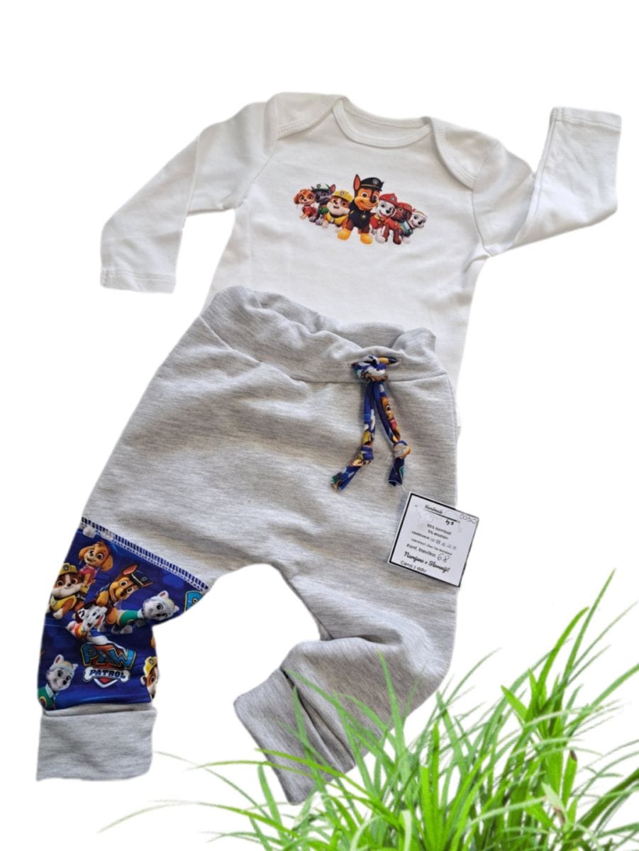 Kompletek baggy hlače in body KUŽKI. Naše zelo prodajne baggy hlačke v kompletu z bodyjem, ki otroku dajejo maksimalno udobje, zaradi elastičnega