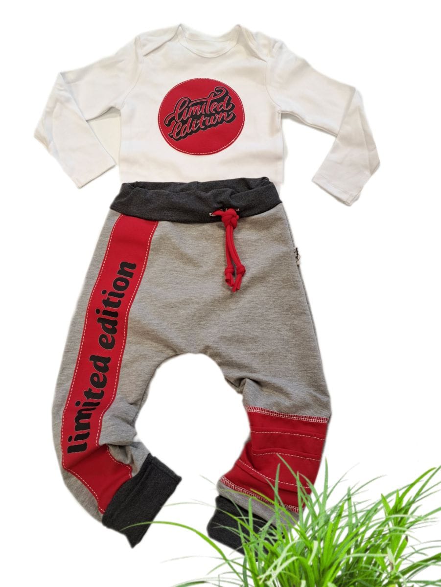 Kompletek baggy hlače in body LIMITED EDITION RDEČ. Naše zelo prodajne baggy hlačke v kompletu z bodyjem, ki otroku dajejo maksimalno udobje, zaradi elastičnega