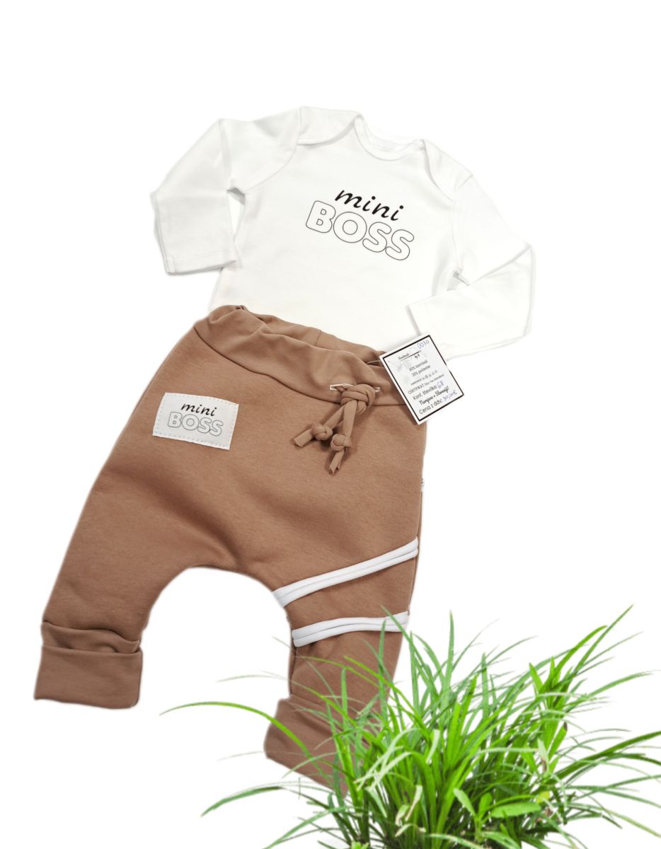 Kompletek baggy hlače in body MINI BOSS. Naše zelo prodajne baggy hlačke v kompletu z bodyjem, ki otroku dajejo maksimalno udobje, zaradi elastičnega