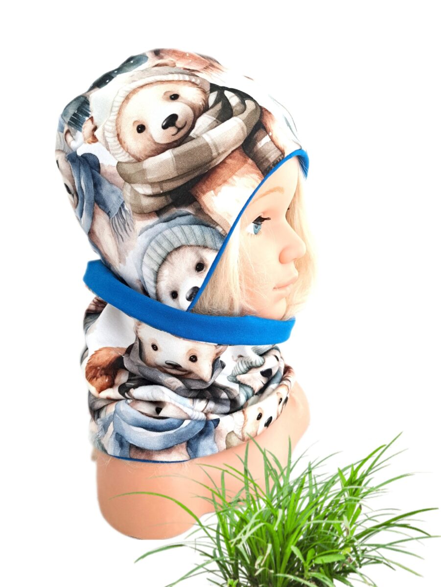 Kompletek s kapo in cevko MEDVEDKI. Kapica je pri ušeskih širša, kar pomeni, da so ušeska ves čas lepo pokrita. Notranja stran je iz jerseya, zunanja stran prevešanka. Kompletek je obojestranski.