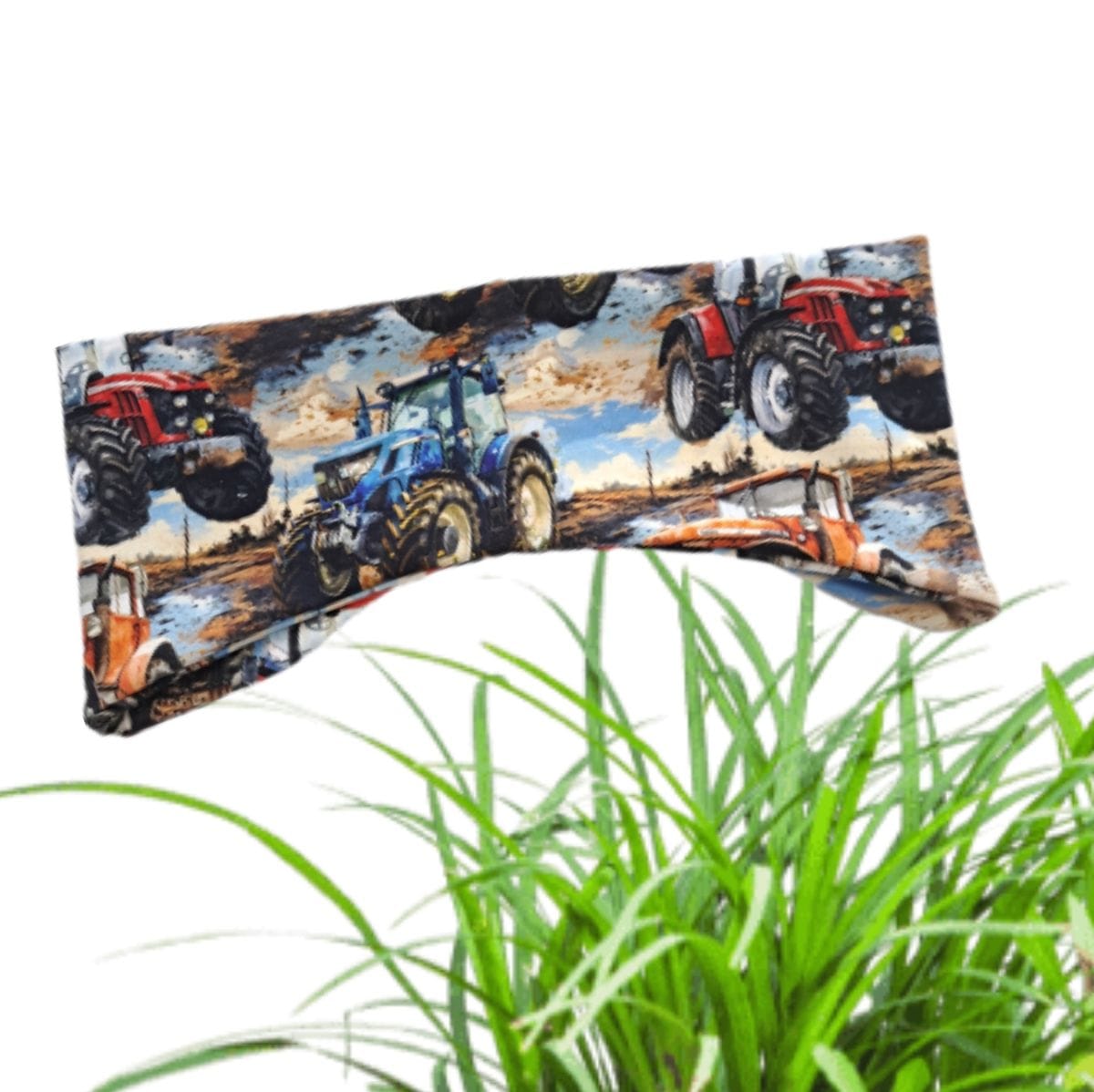 Trak za ušesa BARVNI TRAKTORJI 12+letje izdelan iz jerseya ali prevešanke. Trakec je pri ušesih širši in jih zelo lepo pokrije.