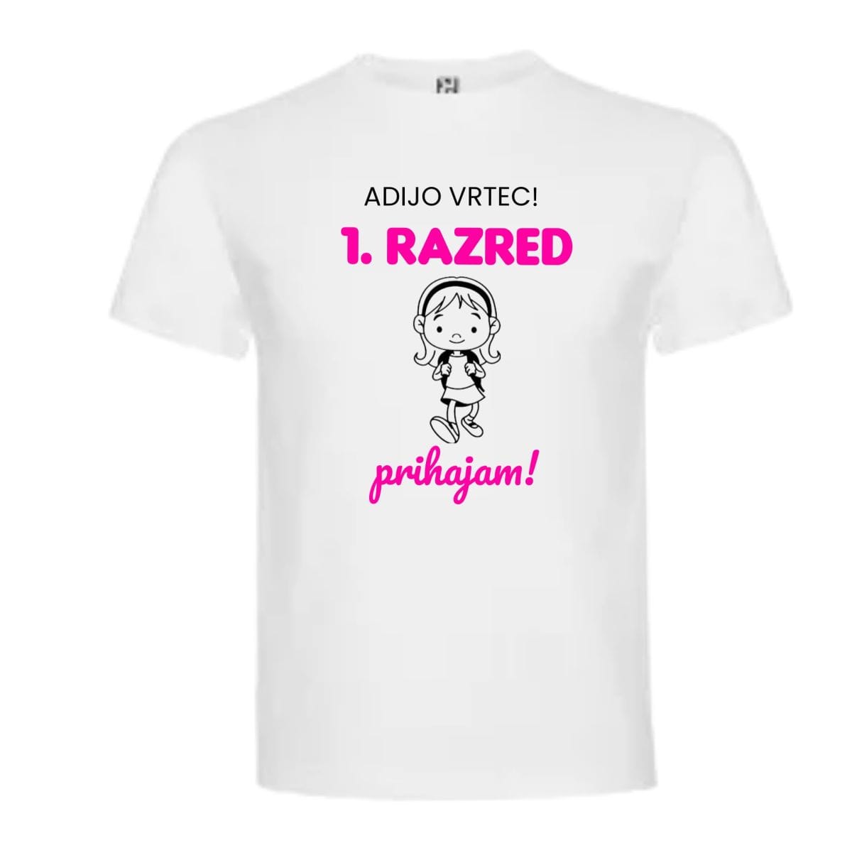 Majica s tiskom ADIJO VRTEC 1. RAZRED PRIHAJAM za punčke. Naj bo prvi šolski dan ali slovo od vrtca nekaj čisto posebnega. Majica ni ročno izdelana – je kupljena, mi pa vam jo z veseljem potiskamo z dtf tiskom.