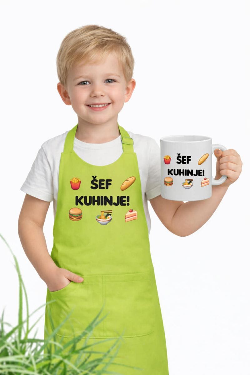 Otroški predpasnik ŠEF KUHINJE. Odlično darilo v času obdarovanj, rojstnih dni ali kar za vsak dan za male kuharske mojstre. Naj bo vsak trenutek v kuhinji poln veselja in ustvarjalnosti.